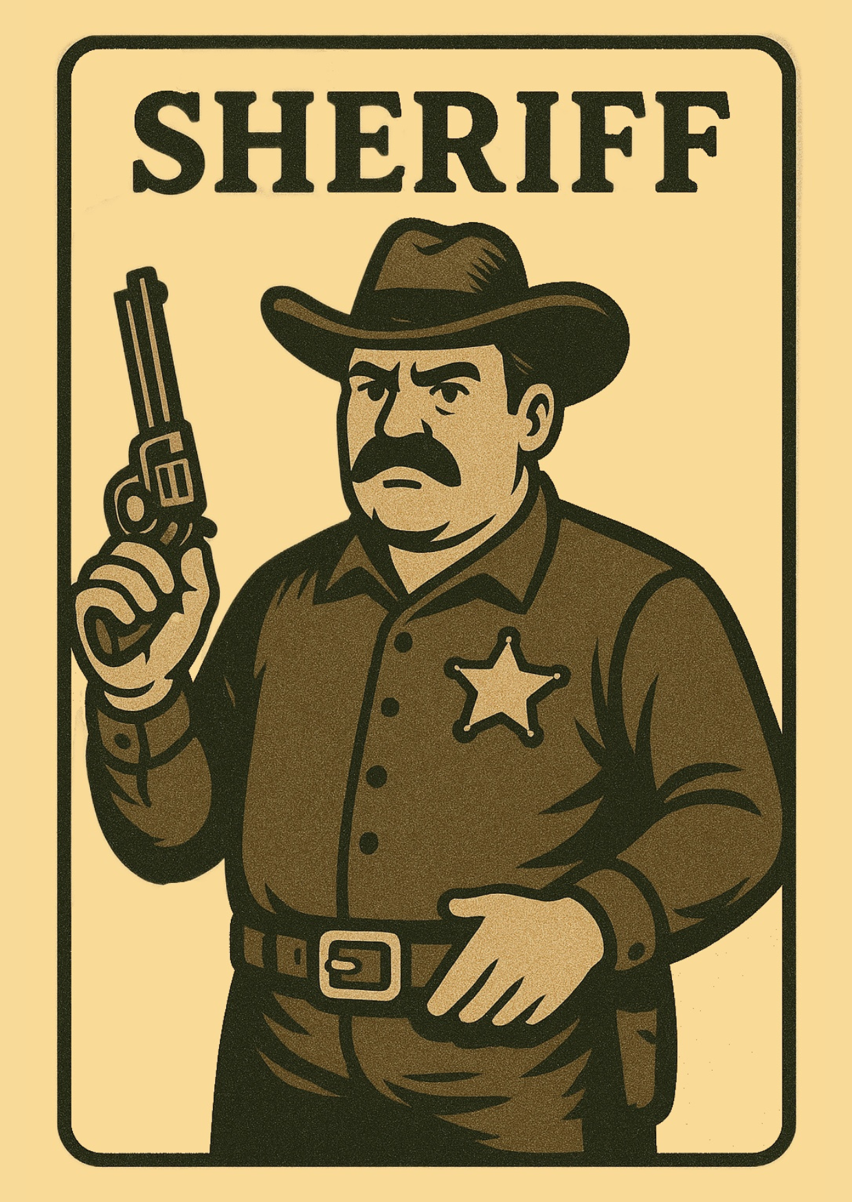 Om du trekker sheriff kortet har du EN mulighet til å eliminere en spiller som du tror er Mafia. Om dette er riktig og du eliminerer en Mafia-spiller blir du ikke eliminert selv, men om du eliminerer en uskyldig blir du selv eliminert og er ute fra spillet. Du har EN mulighet til å treffe Mafia og du får ikke flere sjanser uavhengig om du treffer eller ikke